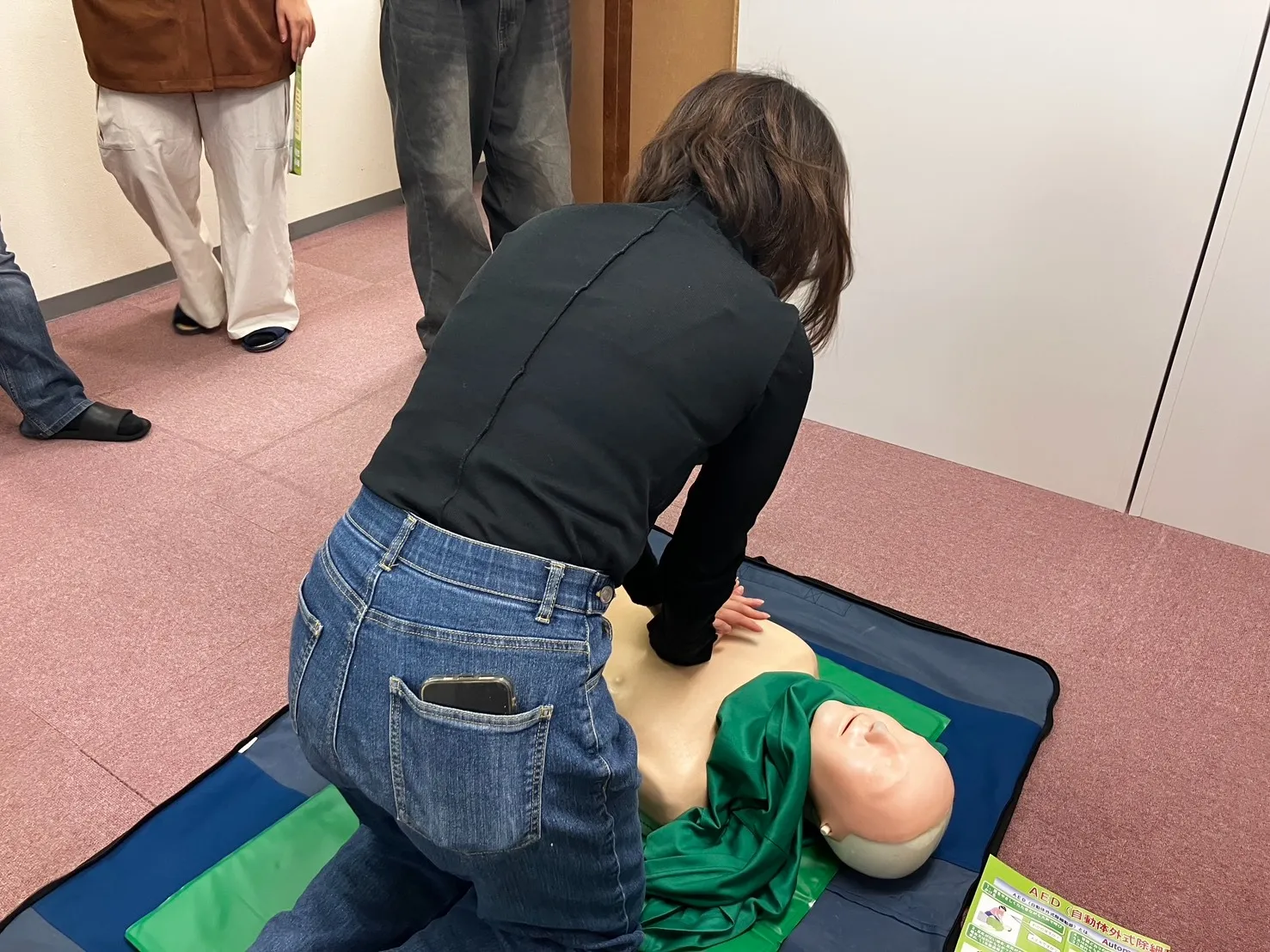実際に胸骨圧迫のやり方の実践、AEDの使い方を教えていただきました。